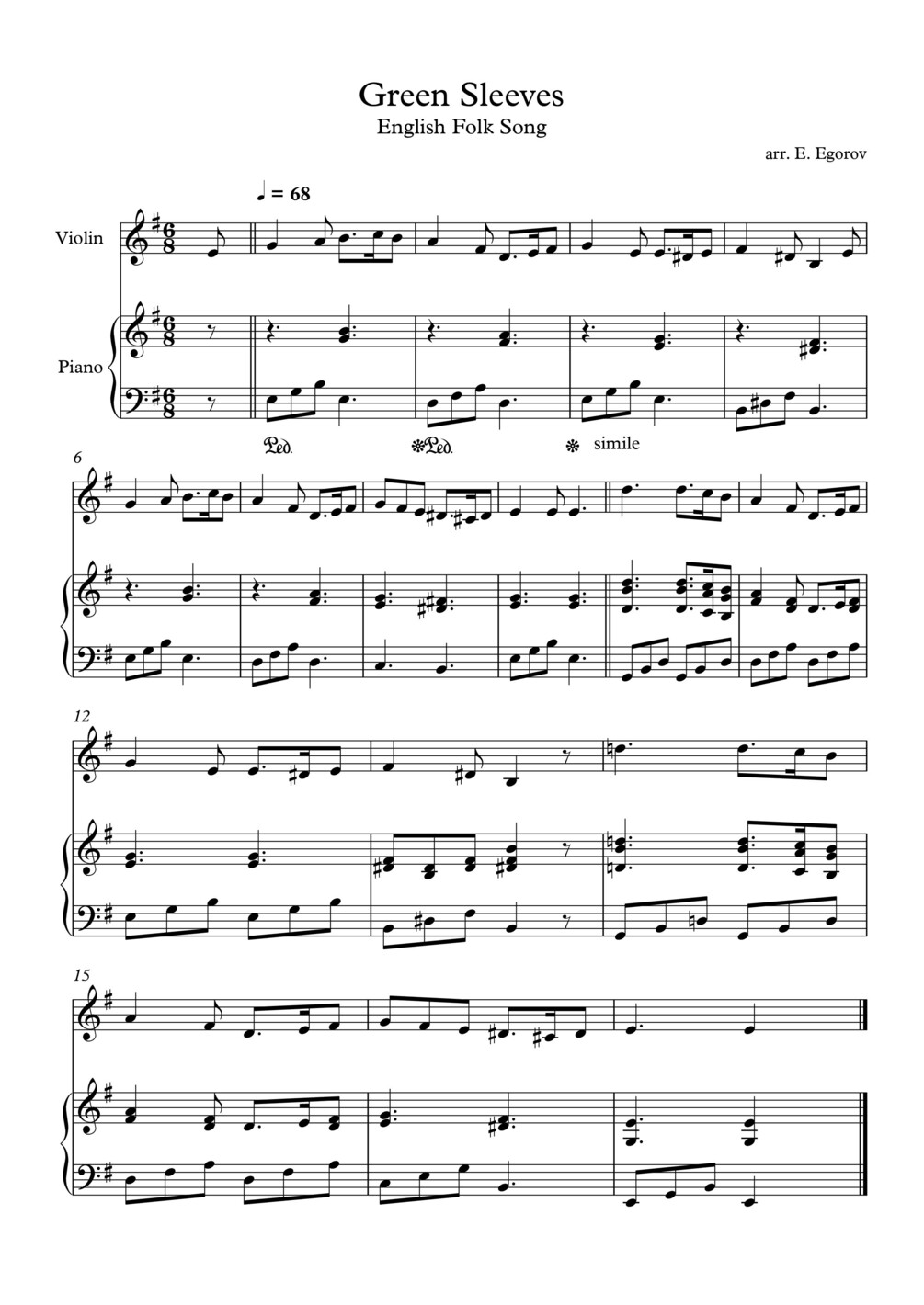 Green Sleeves, English Folk Song, For Violin & Piano